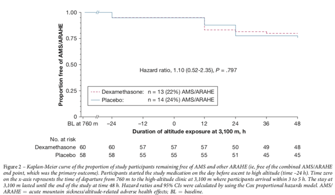 In this randomized, double-blind study conducted in Kyrgyzstan, Michael Furian and team report that while 4 mg twice a day of dexamethasone lessened altitude-induced hypoxemia, it was not superior to placebo for prevention of AMS/ARAHE in patients with mild to moderate COPD. Significantly higher number of patients developed hyperglycemia in the dexamethasone arm. Of note, lower levels of PaO2 at <760 meters did not appear to be protective against AMS/ARAHE in patients with COPD (as hypothesized in the past).