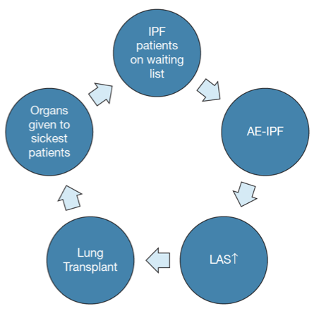 This single-center study by Dr. Yaniv Dotan’s group is the first to report significantly worse short (immediate) and long-term survival (1- to 3-year survival) in AE-IPF patients receiving lung transplant as compared with those IPF patients who were stable. It is notable that these patients do not die from pulmonary causes (eg, pneumonia) but from extrapulmonary chronic diseases and organ failure. Similar to other studies, the authors found that patients with lung allocation scores (LAS) more than 80 have lower survival both prior to and posttransplant.